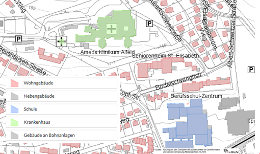 Zudem werden die Gebäude für die Auswertung der Ausbreitungsberechnung verwendet. Hierzu ist es notwendig den Gebäuden hinsichtlich der Lärmkartierung relevante Nutzungen zuzuweisen sowie die maximale Höhe des Gebäudes anzugeben. Über diese Angaben werden den Gebäuden über einen pauschalen Ansatz in einem nachgeordneten Arbeitsschritt vom GAA Hildesheim Einwohner und Wohnungen zugeordnet.
